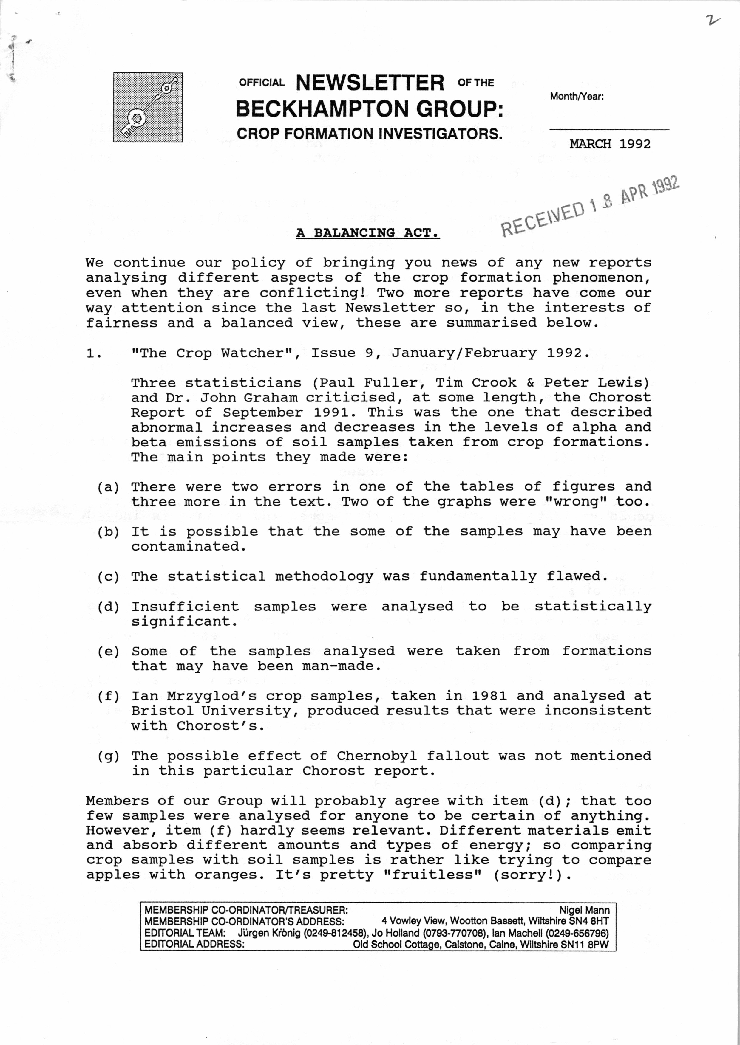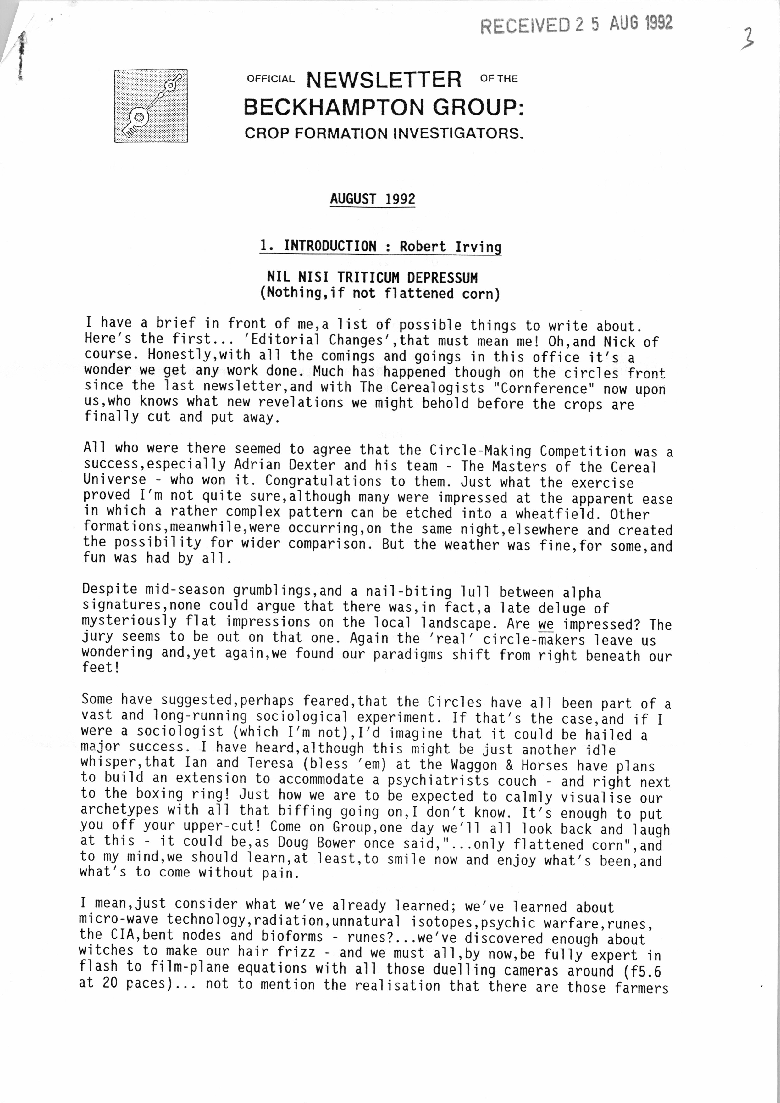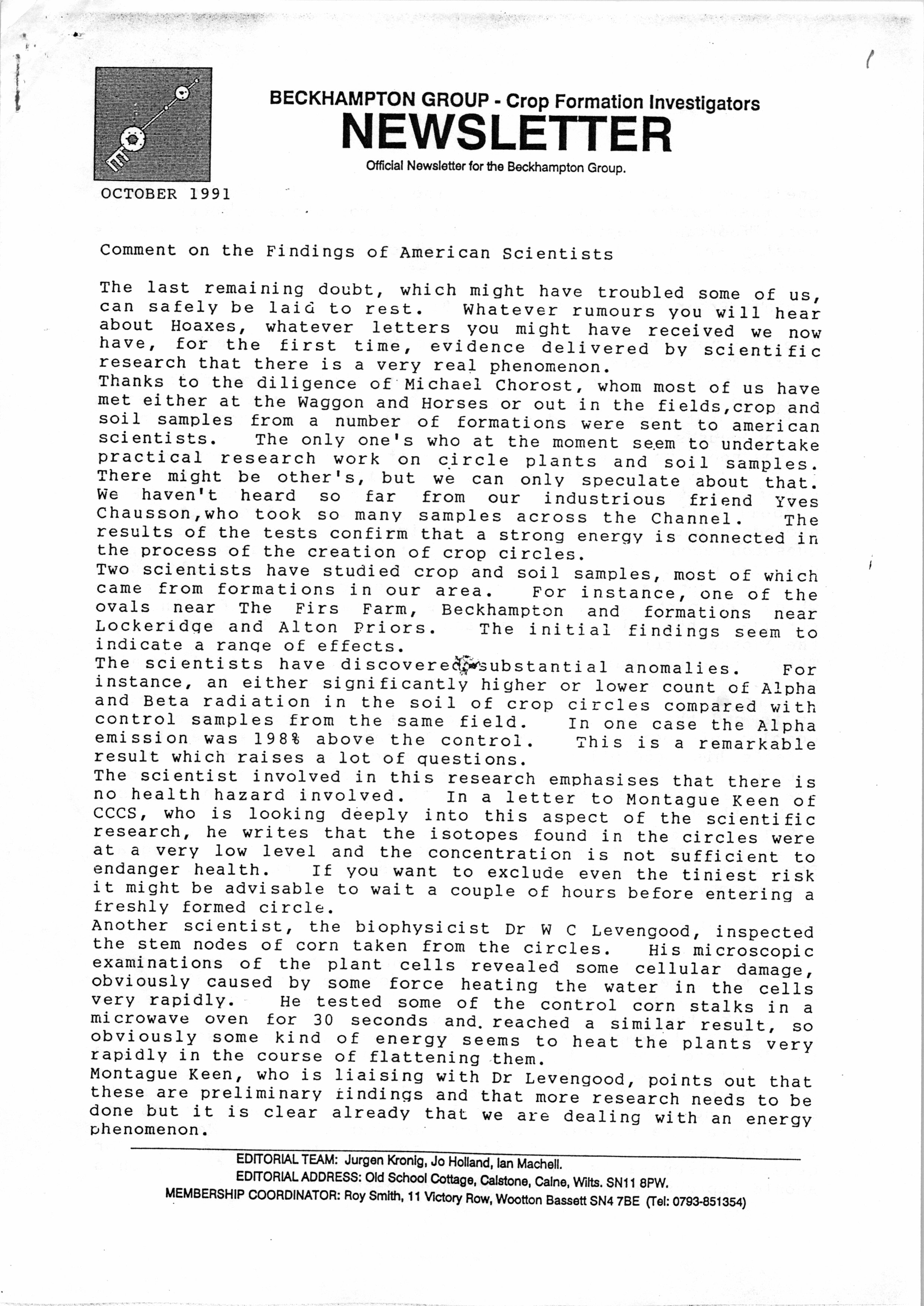 It may surprise some people to learn that in the early 1990s Rob Irving helped to produce the Official Newsletter of the Beckhampton Group: Crop Formation Investigators. Writing articles such as Microbiological Study of a Crop-Circle Site he was joined in the group by both Adrian Dexter and Jim Schnabel. The group was disbanded in August 1992: