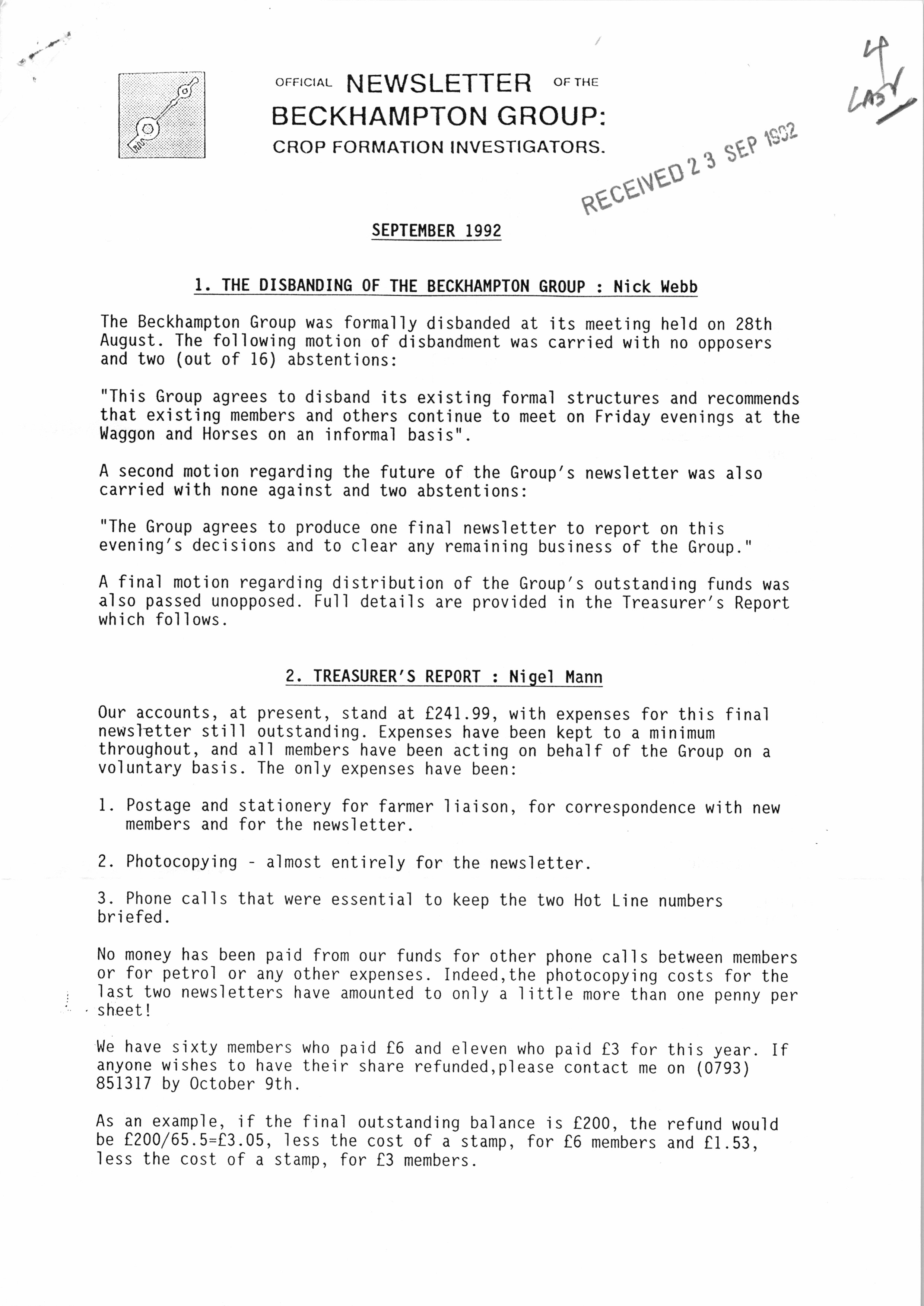 Newsletter September 1992