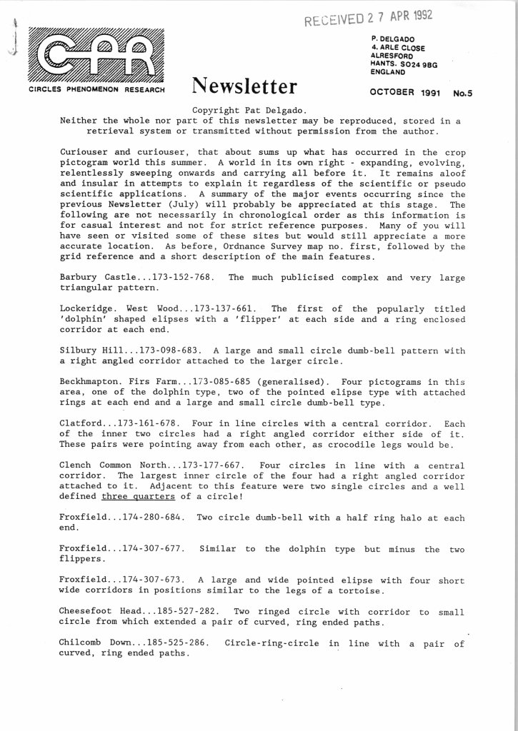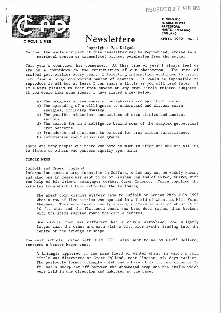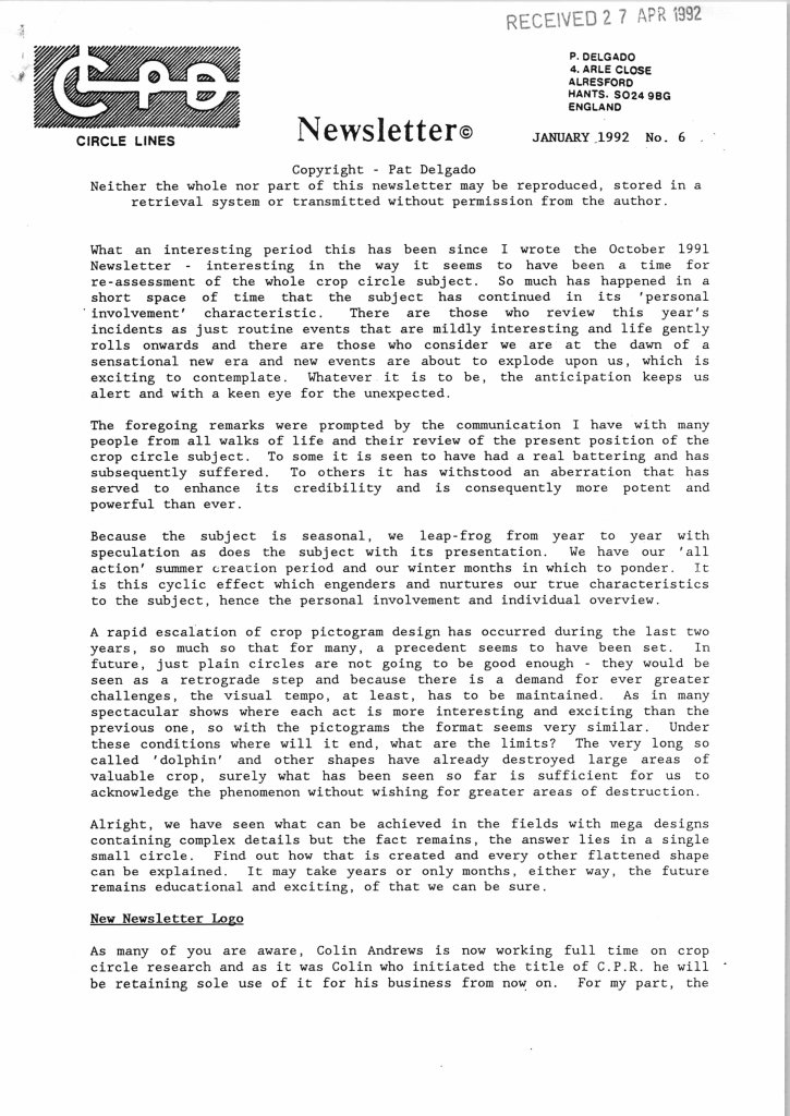 Pat Delgado and Colin Andrews produced their Circles Phenomenon Research (CPR) newsletter which later became Circle Lines (CPD) for several years from 1990 onwards: