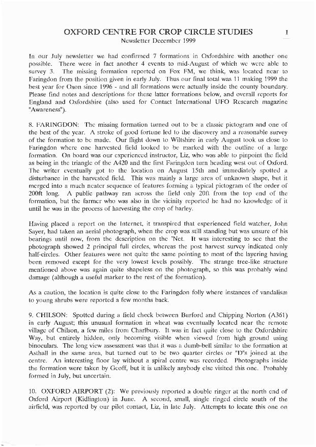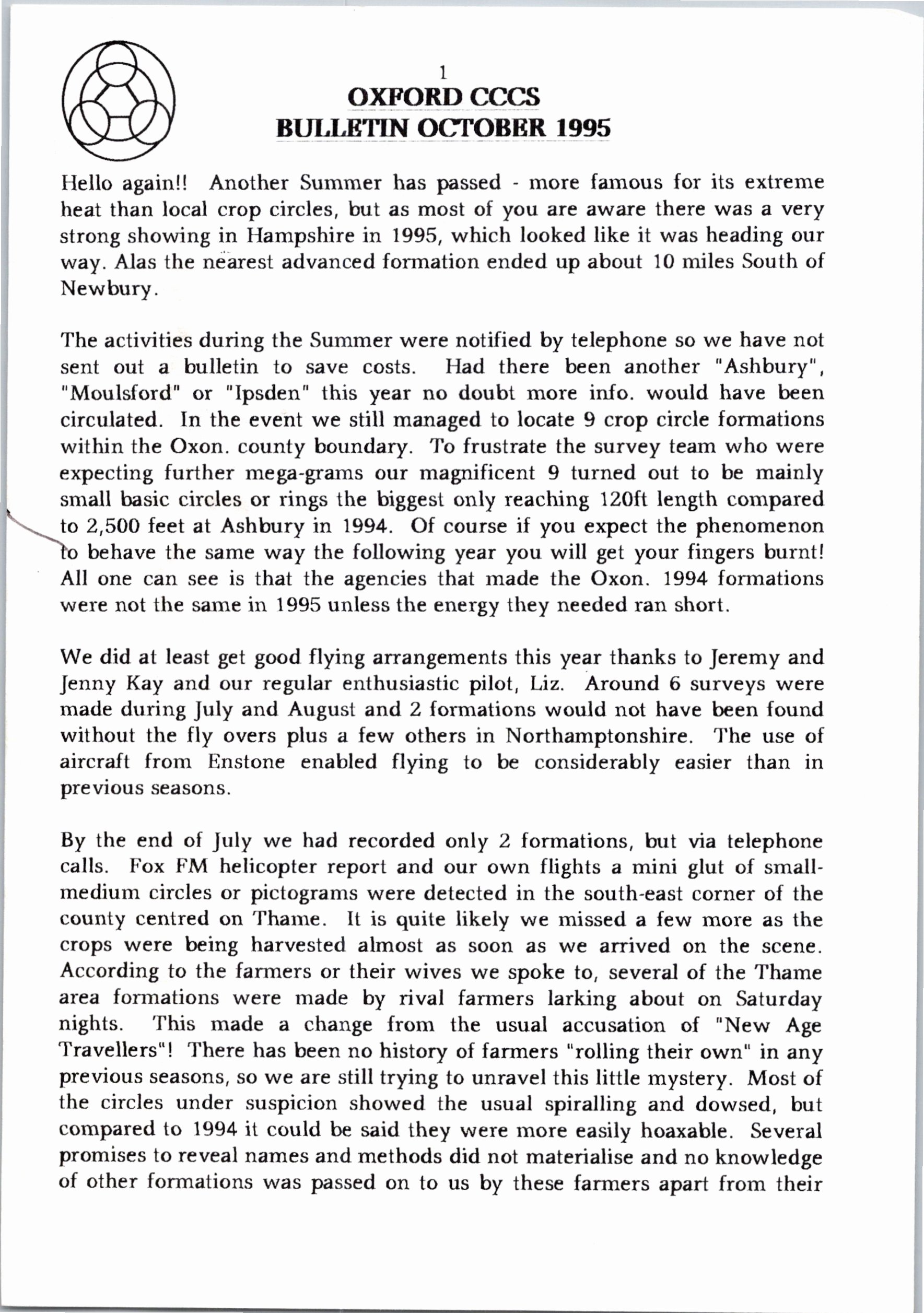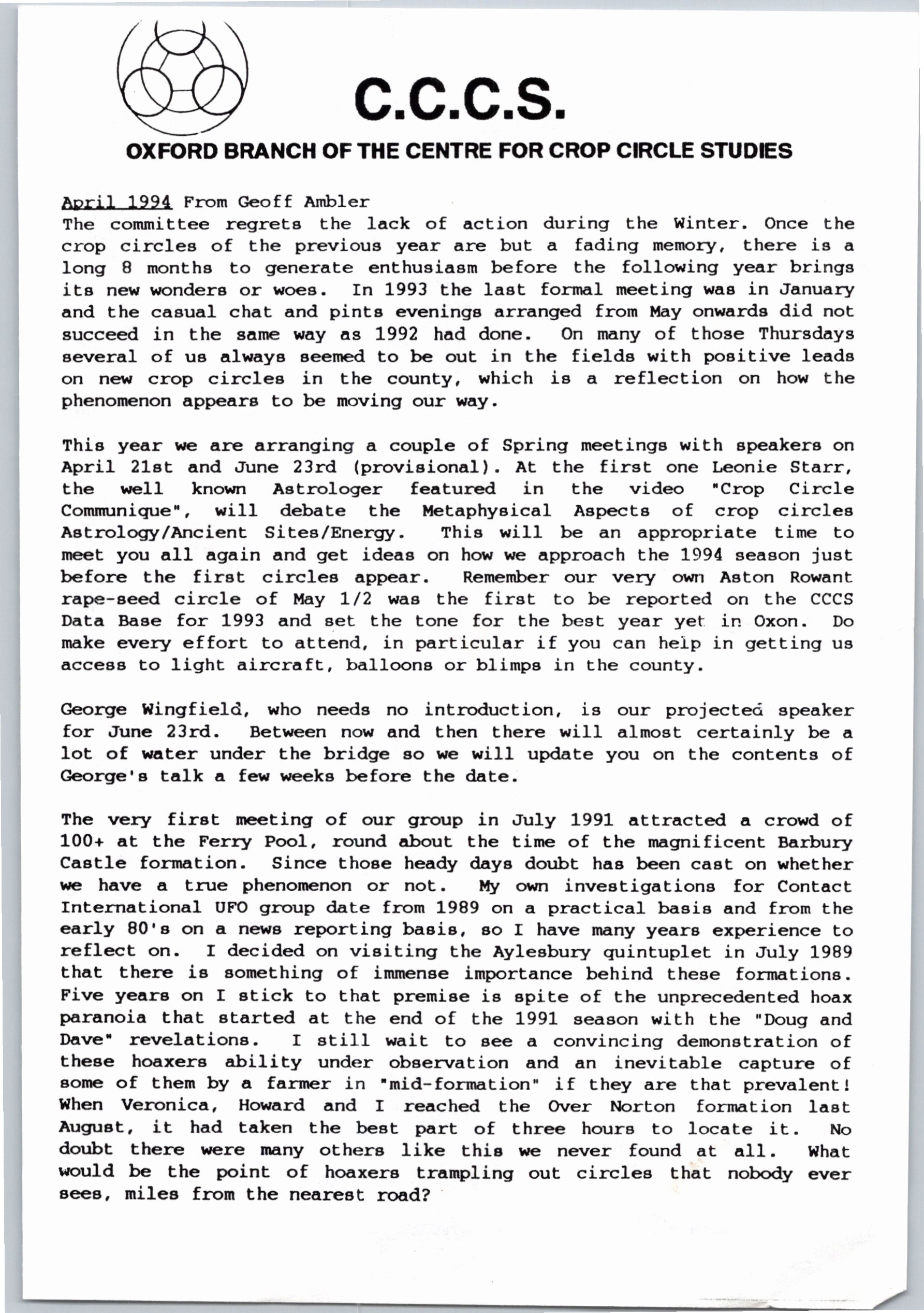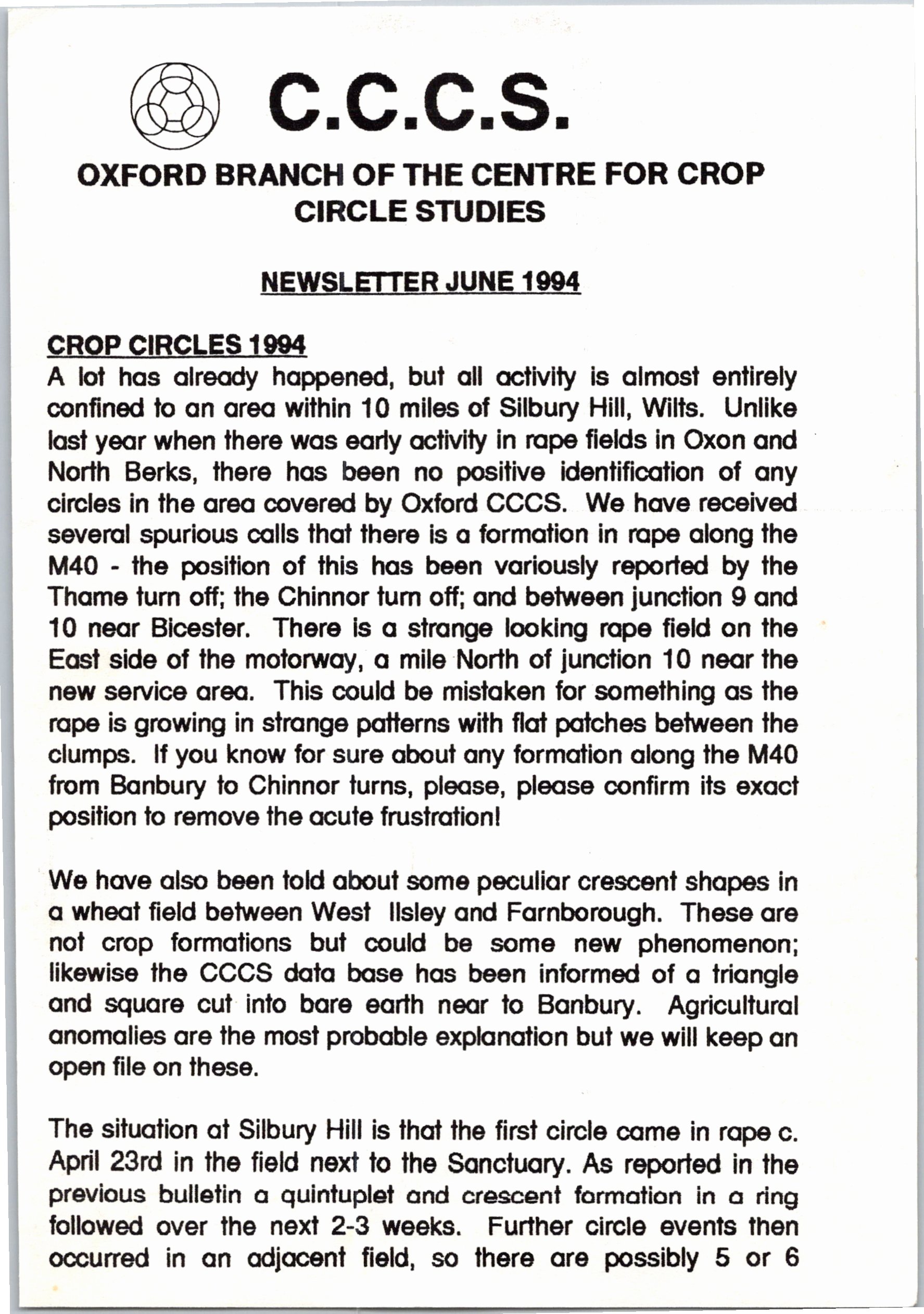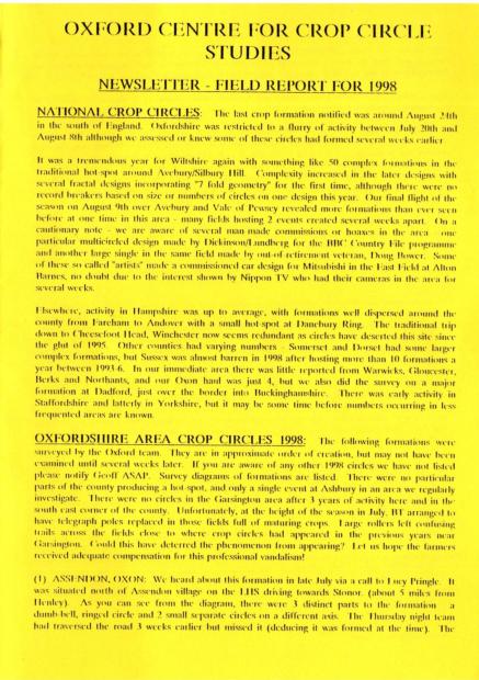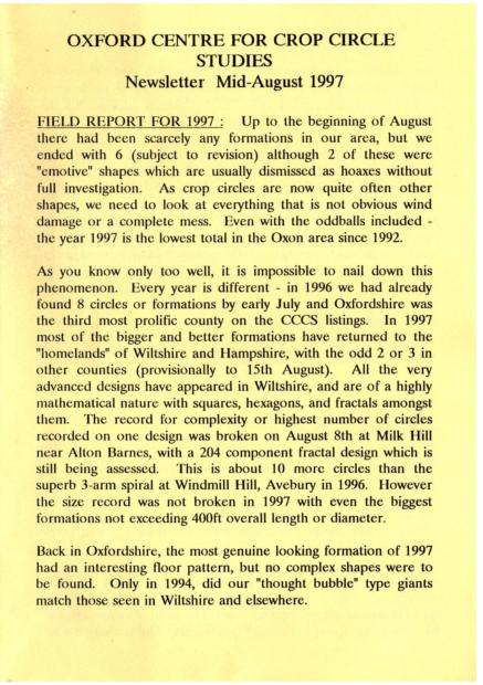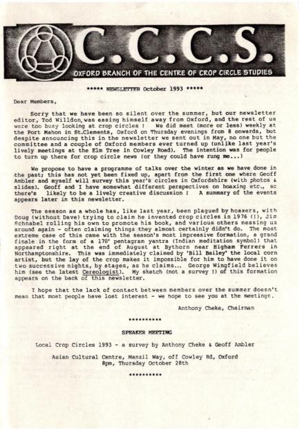 From as early as 1992, the Oxford branch of the Centre for Crop Circle Studies held regular meetings and published an ad-hoc newsletter. The branch was also one of the first to have their own website, showcasing Oxfordshire crop formations: