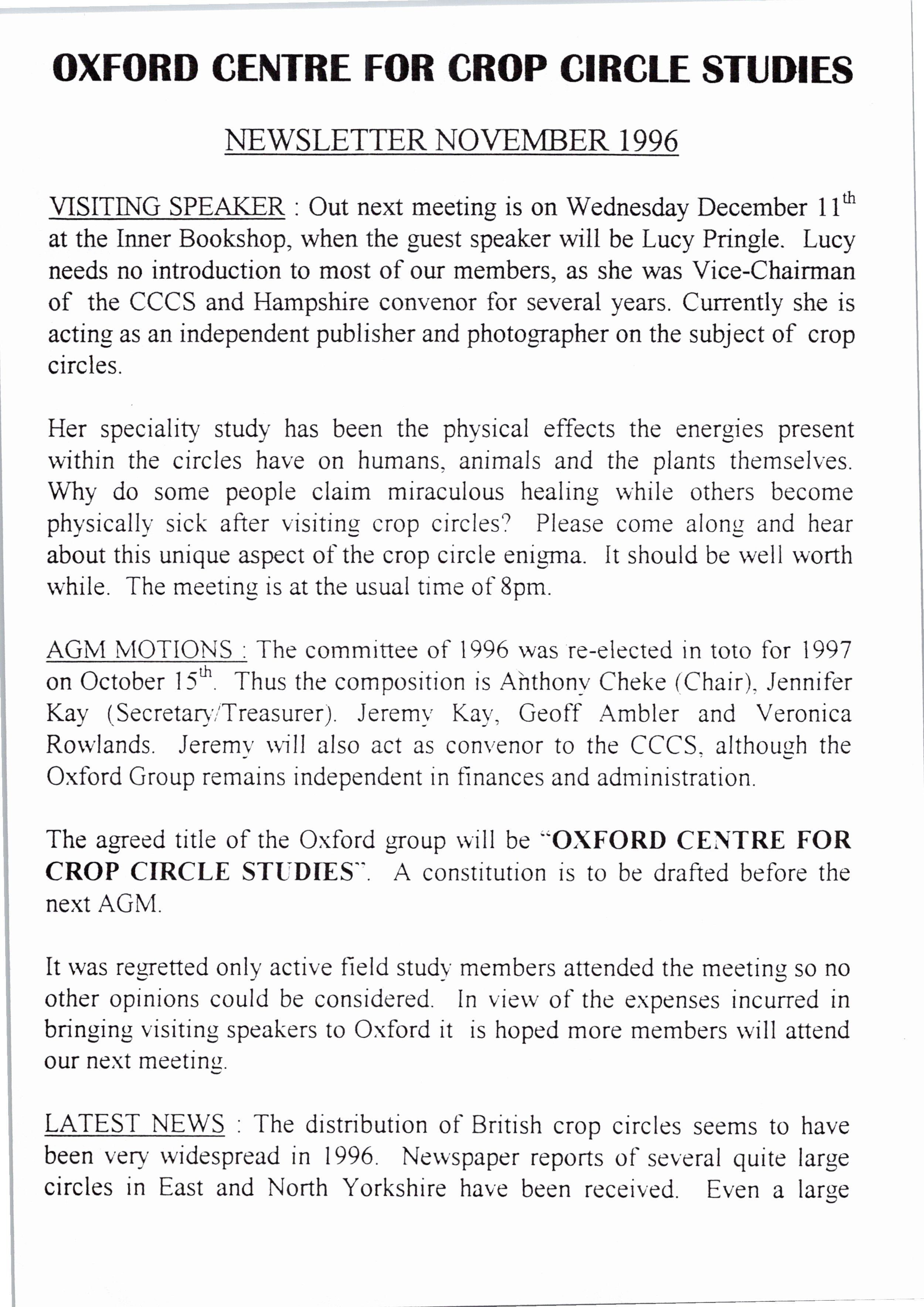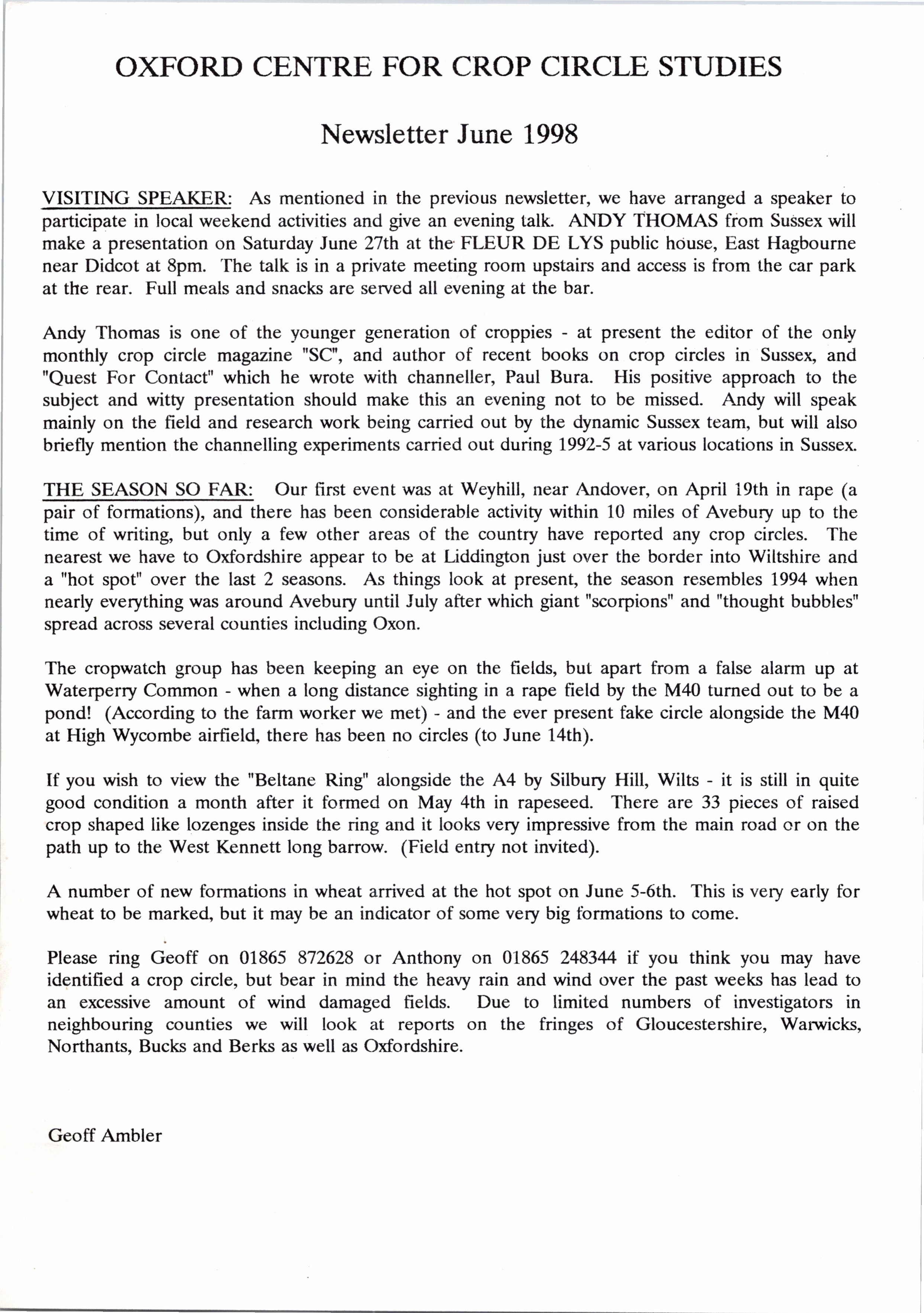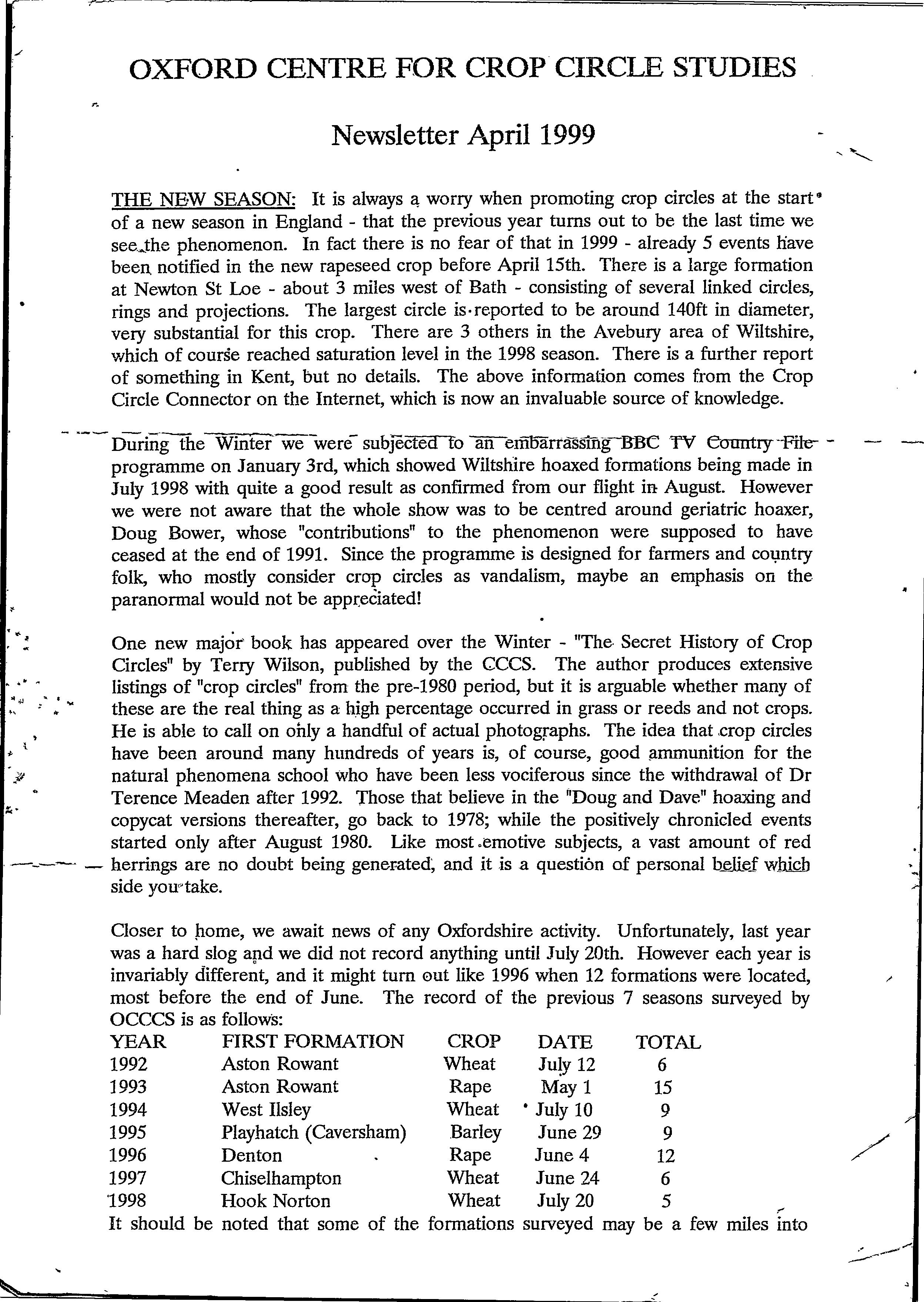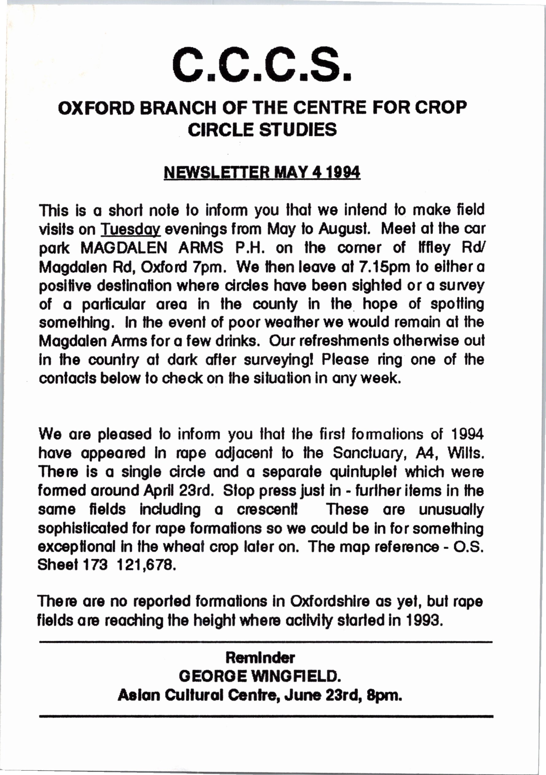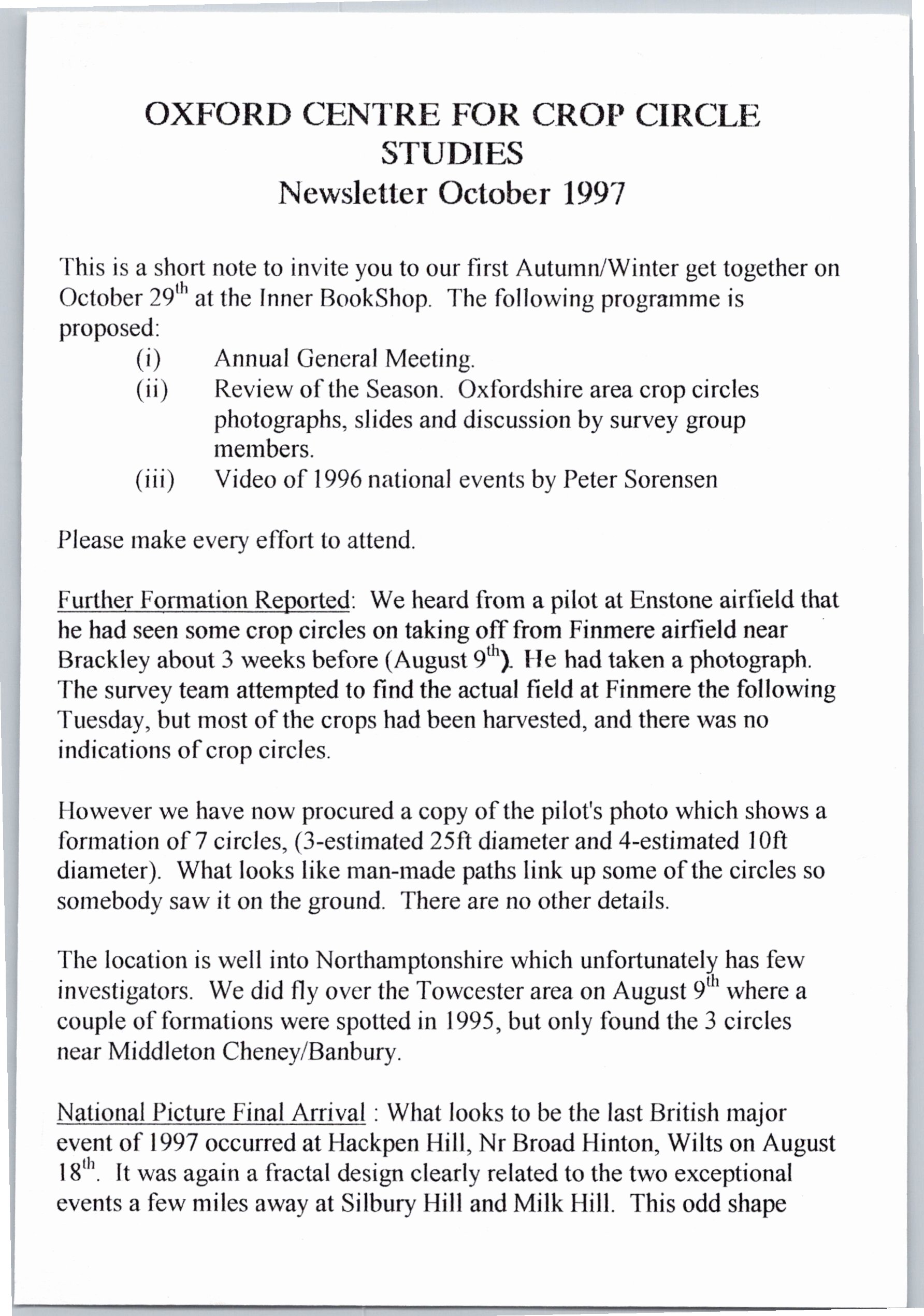 From as early as 1992, the Oxford branch of the Centre for Crop Circle Studies held regular meetings and published an ad-hoc newsletter. The branch was also one of the first to have their own website, showcasing Oxfordshire crop formations:
