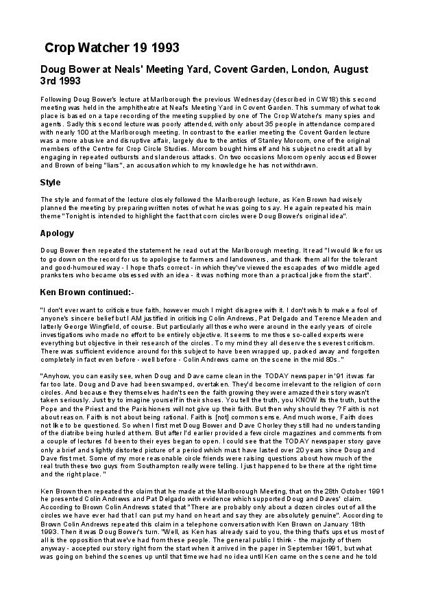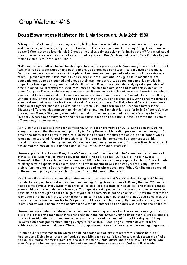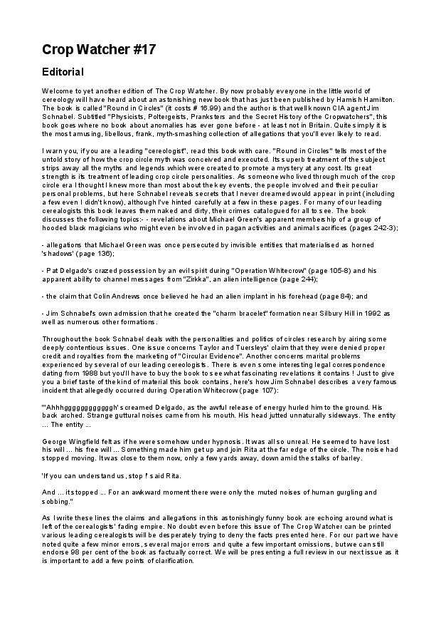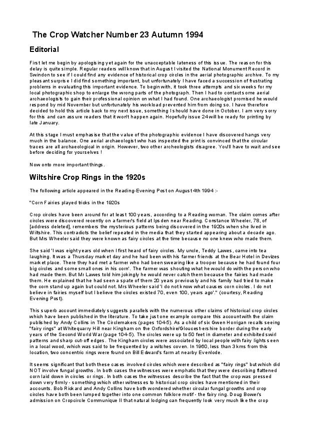 Paul Fuller produced The Crop Watcher for several years during the early / mid 1990s. It was an independent non-profit-making magazine devoted to the scientific study of crop circles and the social mythology that accompanies them. The unformatted versions of #16 to #23 are all that we currently possess: