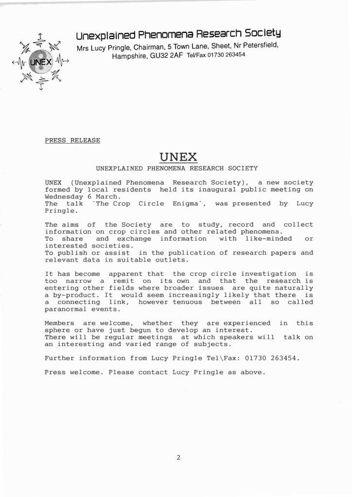 The Unexplained Phenomena Research Society, and its associated membership newsletter UNEX News, was launched by Lucy Pringle in March 1996 with the aim to “study, record and collect information on crop circles and other related phenomena”: