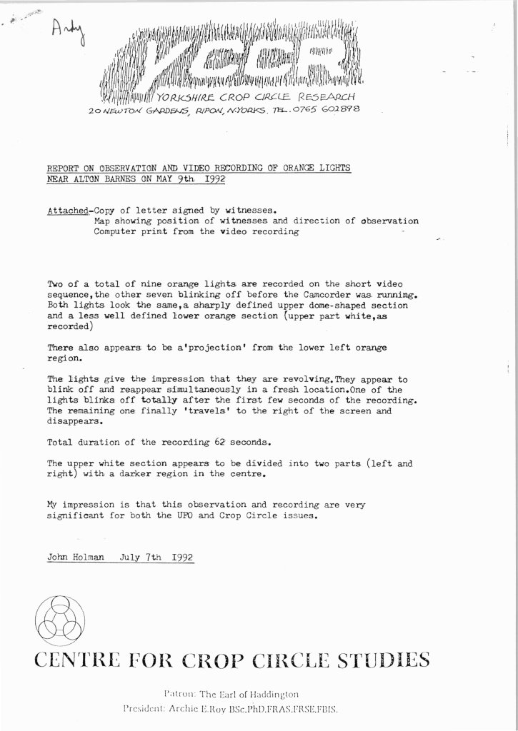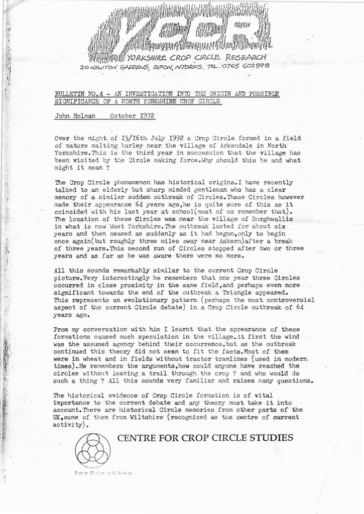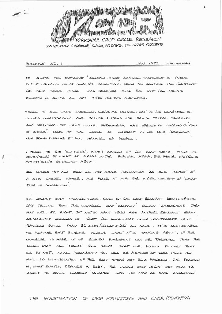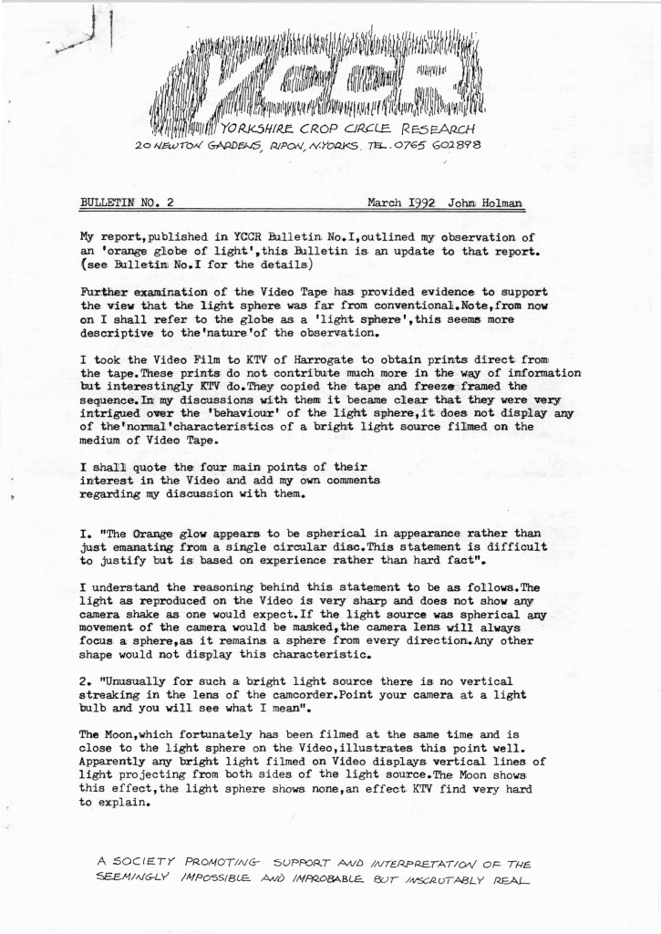 YCCR Bulletin #1 Jan 1992YCCR Bulletin #2 Mar 1992YCCR Bulletin #3 Oct 1992YCCR Bulletin #4 Oct 1992YCCR Report (1) Lights Near Alton Barnes May 1992YCCR Report (2) Blansby Park July 1992YCCR Report (3) Arkandale July 1992