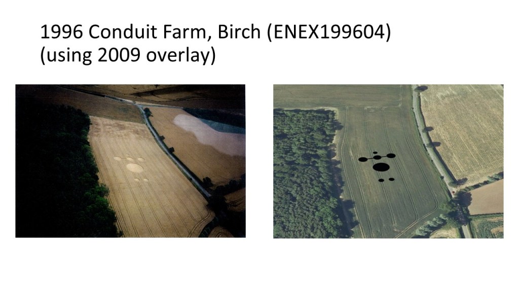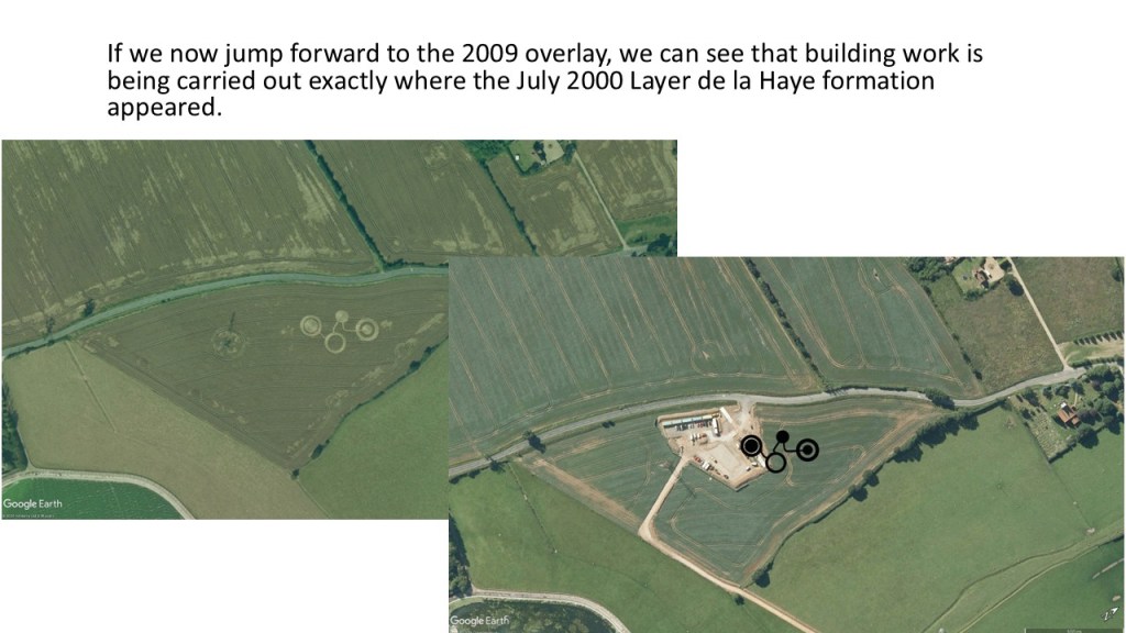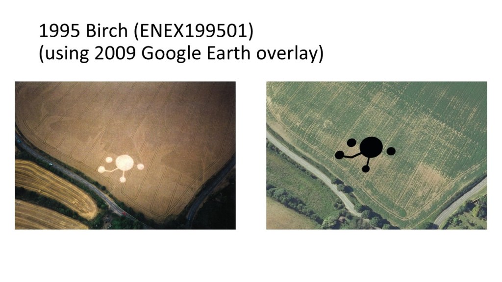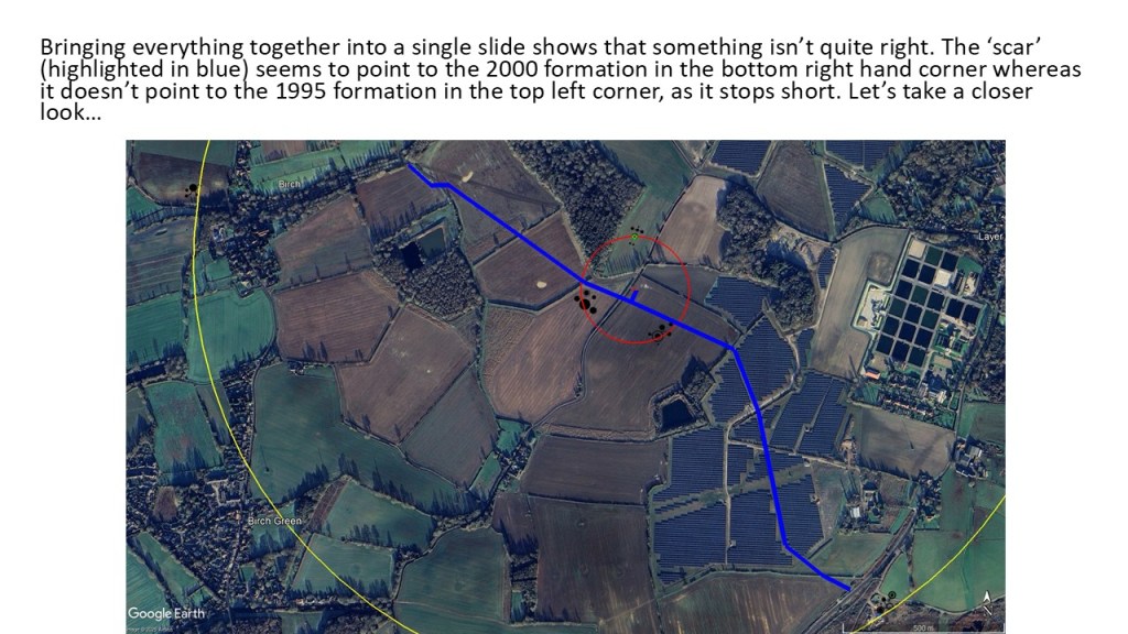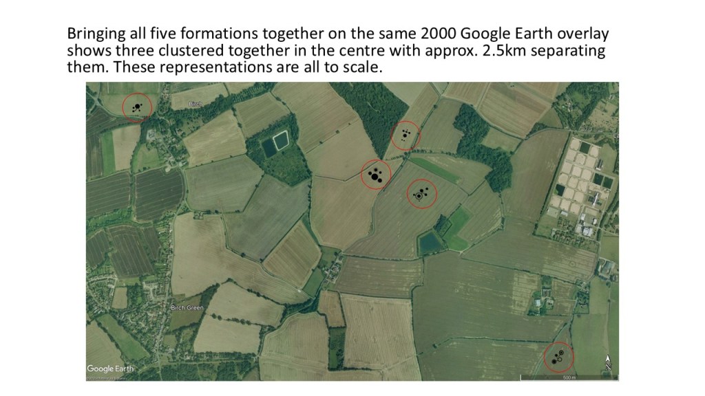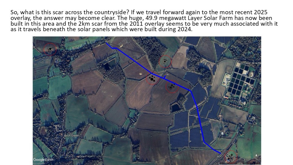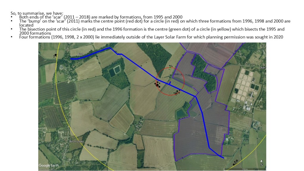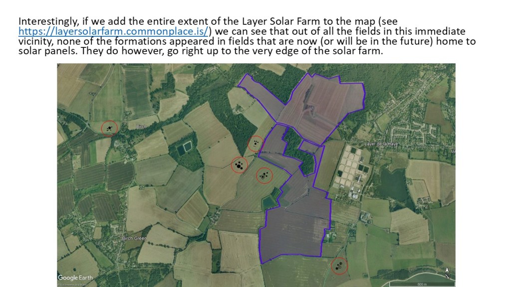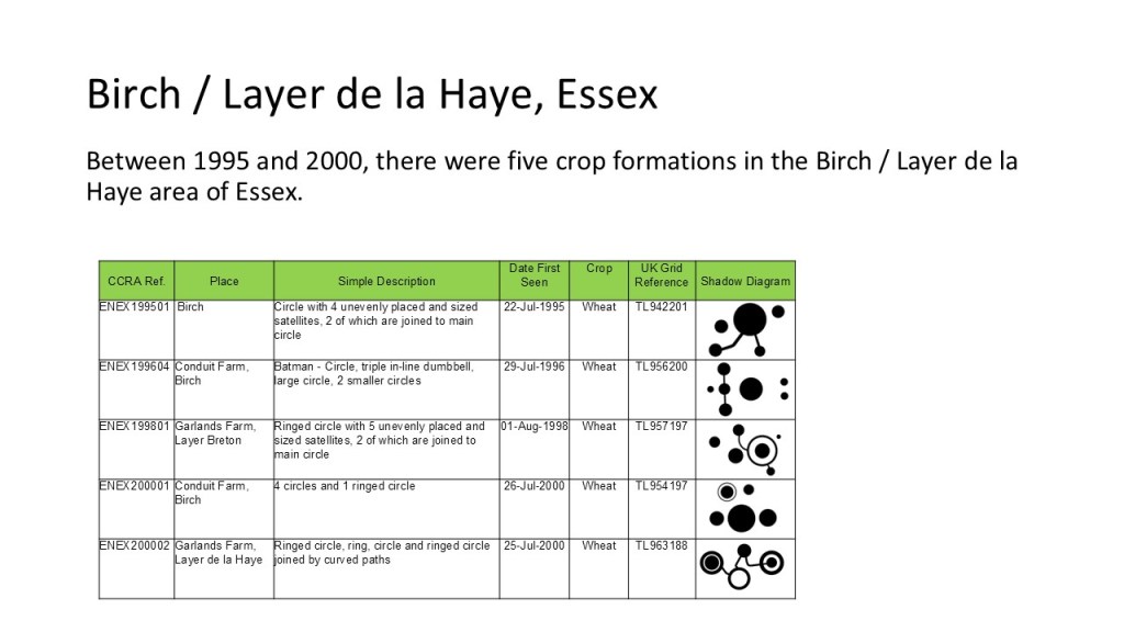 The presentation below shows what happened in the area around Birch / Layer de la Haye in Essex after five crop formations appeared between 1995 and 2000. Google Earth has been used extensively to ensure the formations are overlaid into the landscape as accurately as possible. Planning for the Layer Solar Farm had not begun at that time and the route of the underground cable had not been determined.